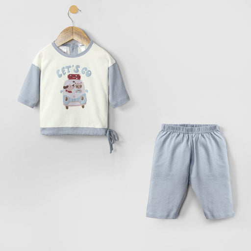 A playful two-piece outfit featuring a soft cream and Pearl blue top with a cute “Let’s Go” car print, paired with comfy elastic Trouser. Made from...