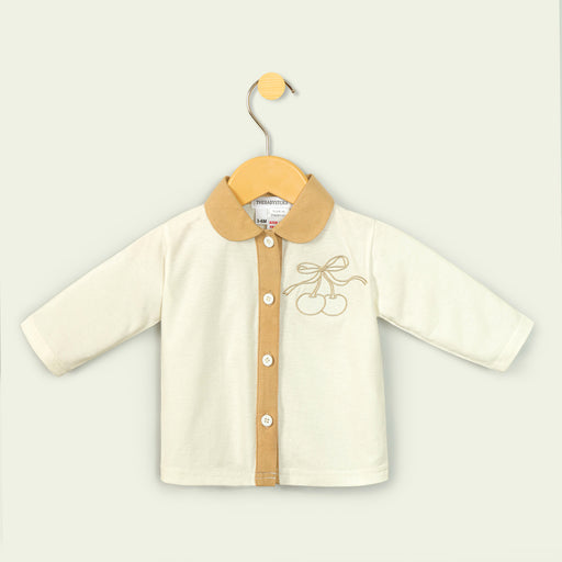 An elegant two-piece outfit in soft cream with golden accents, featuring a button-down top embroidered with delicate cherries and ruffled hem pants...