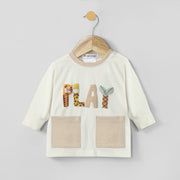 A cute two-piece outfit featuring a cream top with playful โPLAYโ jungle-themed lettering and handy front pockets, paired with soft beige trousers. Made from breathable cotton for all-day comfort. Perfect for your little oneโs fun and adventurous playtime.