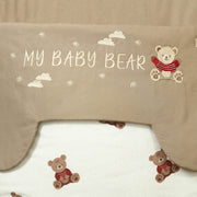 Designed to keep infants warm and comfortable. The upper flap features soft embroidery with the text “My Baby Bear” and an adorable teddy bear motif, while the lower body showcases an all-over teddy print on a soft cotton fabric. The design includes side ties for secure fastening and padded ears on top for extra charm. Perfect for newborns and infants, providing warmth, comfort, and a safe snuggle environment.